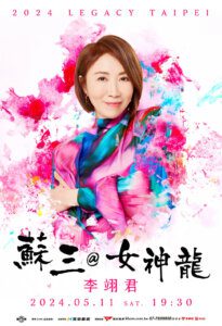 2024讚聲演唱會陣容:李翊君《蘇三@女神龍》將在5月11日於華山Legacy舉行,購票請洽寬宏售票系統、全台萊爾富、OK便利商店。