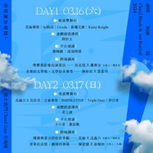 《2024後謠景像詩 Cloud Music & Art Festival》音樂節即將於3/16(六)- 3/17(日)於淡水雲門劇場舉辦,備受矚目的總Line Up全面公開,最後一波邀請海外兩大後搖團包括京城後搖傳說文雀、曼谷後搖大團INSPIRATIVE參戰!